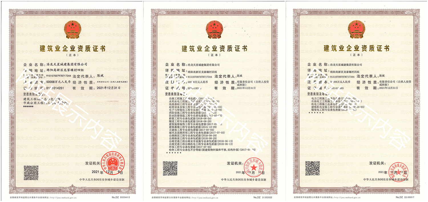 浩龍?zhí)煨浅墙瘓F(tuán)有限公司,2007年成立于“李白故鄉(xiāng)、中國科技城”—四川省綿陽市,企業(yè)注冊資本金5.0008億元。公司共有27項(xiàng)建筑業(yè)企業(yè)資質(zhì),其中國家一級資質(zhì)11項(xiàng),二級資質(zhì)10項(xiàng),三級資質(zhì)5項(xiàng),特種資質(zhì)不分等級1項(xiàng),類別涵蓋建筑、市政、水利、機(jī)電、隧道、起重設(shè)備安裝等基礎(chǔ)及未來發(fā)展重點(diǎn)專業(yè)。公司...